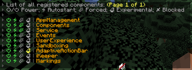 With `/component list` you can see a list full of components. All the running and currently not running components are listed here, with each having multiple indicators, showing their current status and behavior.